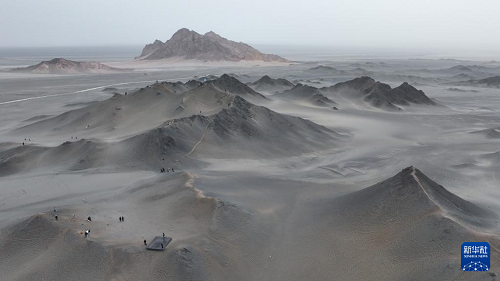 7月30日,游客在冷湖鎮(zhèn)黑獨(dú)山游玩(無人機(jī)照片)。(新華社記者 張龍 攝)