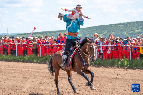 8月7日,演員在農(nóng)牧民那達(dá)慕大會(huì)上表演馬術(shù)。(新華社記者 馬金瑞 攝)