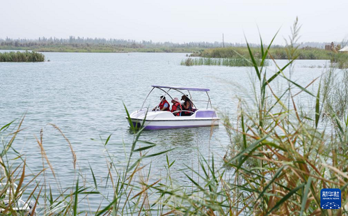 8月10日,游客在瑪納斯國家濕地公園游玩。(新華社記者 周佳誼 攝)
