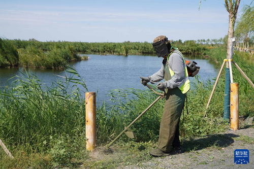 8月10日,工作人員在瑪納斯國家濕地公園清除雜草。(新華社記者 周佳誼 攝)