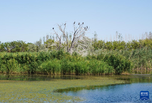 8月10日,鸕鶿在瑪納斯國家濕地公園樹枝上棲息。(新華社記者 周佳誼 攝)