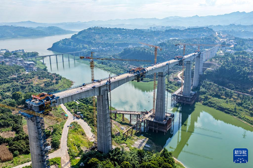 這是8月18日拍攝的渝萬高鐵渠溪河雙線特大橋施工現(xiàn)場(無人機照片)。(新華社記者 唐奕 攝)