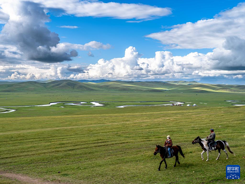 8月19日,在內蒙古呼倫貝爾市陳巴爾虎旗,人們在莫爾格勒河畔騎馬。(新華社記者 馬金瑞 攝)