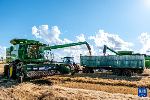 8月20日,呼倫貝爾農(nóng)墾拉布大林農(nóng)場的工人駕駛農(nóng)機將收獲的小麥裝車。(新華社記者 馬金瑞 攝)