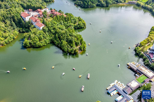 8月21日,游客在黃水鎮(zhèn)月亮湖景區(qū)泛舟游玩(無人機(jī)照片)。(新華社記者 唐奕 攝)