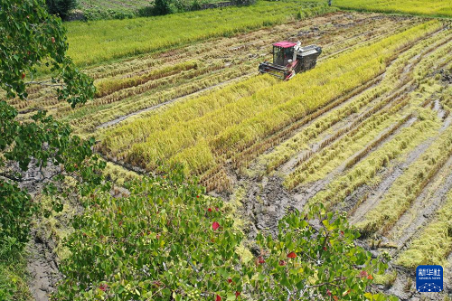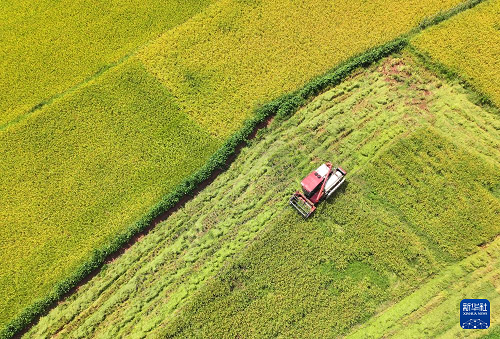 8月23日,農(nóng)民駕駛收割機在湖南省湘西土家族苗族自治州龍山縣石羔街道收割水稻(無人機照片)。(新華社發(fā) 曾祥輝 攝)