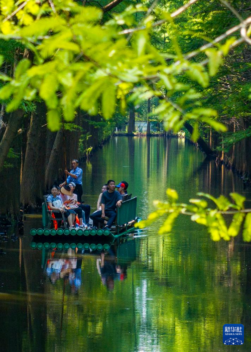 8月30日,游人在江蘇省淮安市金湖縣水上森林景區(qū)乘坐竹筏游覽美景(無(wú)人機(jī)照片)。(新華社發(fā) 周社根 攝)