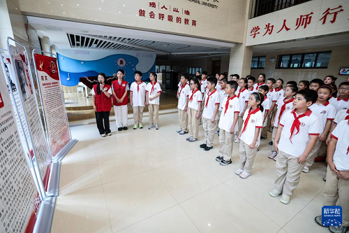 9月4日,北京師范大學(xué)南湖附屬學(xué)校的老師在給學(xué)生們講解“致敬禾城鐵血·同輝國旗榮光”——嘉興市新四軍老戰(zhàn)士抗戰(zhàn)英勇事跡圖版巡展的英雄事跡。(新華社記者 徐昱 攝)