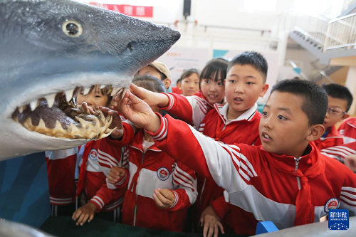 9月8日,在甘肅省定西市舉辦的“山海相依,筑夢蔚藍(lán)”山東青島·甘肅定西海洋科普東西部協(xié)作主題活動中,定西市安定區(qū)關(guān)川實驗學(xué)校的學(xué)生在觀看海洋生物標(biāo)本。(新華社發(fā) 王克賢 攝)