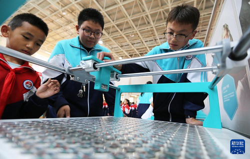 9月8日,在甘肅省定西市舉辦的“山海相依,筑夢蔚藍(lán)”山東青島·甘肅定西海洋科普東西部協(xié)作主題活動中,定西市安定區(qū)關(guān)川實驗學(xué)校的學(xué)生在流動科技館內(nèi)體驗科普裝置。(新華社發(fā) 王克賢 攝)