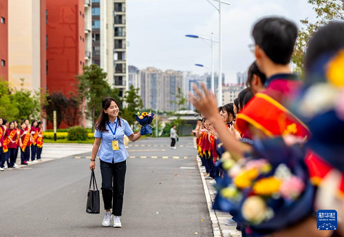 9月10日,學(xué)生在貴州省黔西第一中學(xué)列隊(duì)歡迎到校教師。(新華社發(fā) 范暉 攝)