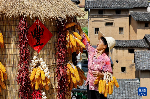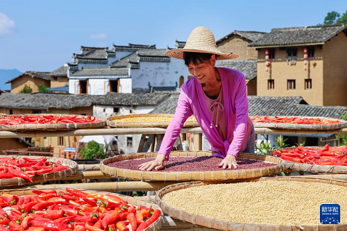 9月17日,安徽黃山歙縣陽(yáng)產(chǎn)村村民在土樓前晾曬農(nóng)作物。(新華社發(fā) 施亞磊 攝)