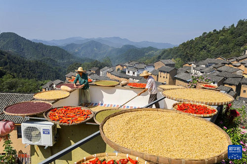 秋收時(shí)節(jié),在安徽省黃山市歙縣深渡鎮(zhèn)陽(yáng)產(chǎn)村,村民利用晴好天氣,抓緊晾曬收獲的辣椒、玉米、山核桃等農(nóng)作物,描繪出一幅山村“曬秋”圖。