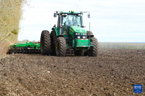 10月8日,在北大荒集團(tuán)北安分公司趙光農(nóng)場有限公司第六管理區(qū),一臺大型聯(lián)合整地機(jī)在剛完成收獲的大豆地塊進(jìn)行整地作業(yè)。(新華社發(fā) 錢泊羽 攝)