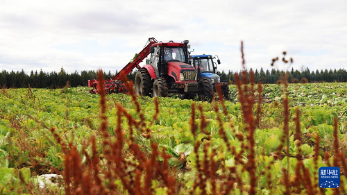 10月8日,在北大荒集團(tuán)黑龍江紅星農(nóng)場第四管理區(qū),農(nóng)機(jī)在收獲白菜。(新華社發(fā) 侯越 攝)