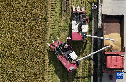 10月10日,湖北省宜昌市秭歸縣沙鎮(zhèn)溪鎮(zhèn)長(zhǎng)春村村民駕駛農(nóng)機(jī)在田間收獲水稻。(新華社發(fā) 王罡 攝)