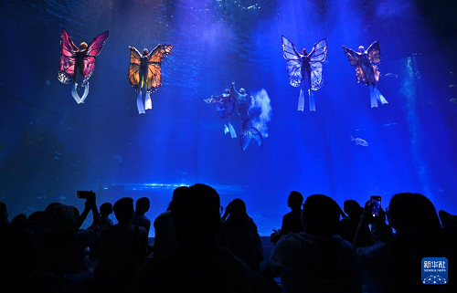 10月18日,游客在海南海洋歡樂世界度假區(qū)觀看水下表演。(新華社記者 郭程 攝)