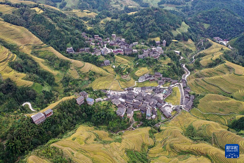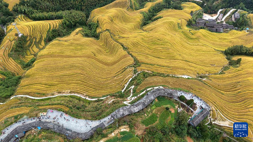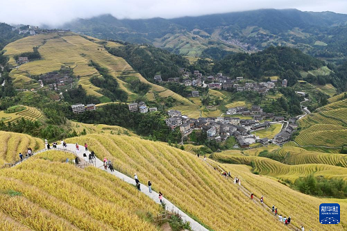 眼下,廣西龍勝各族自治縣龍脊梯田一片金黃,成為眾多游客觀光“打卡”的熱門景點。龍脊梯田已有2300多年歷史,是聯(lián)合國糧農(nóng)組織認(rèn)證的全球重要農(nóng)業(yè)文化遺產(chǎn)。