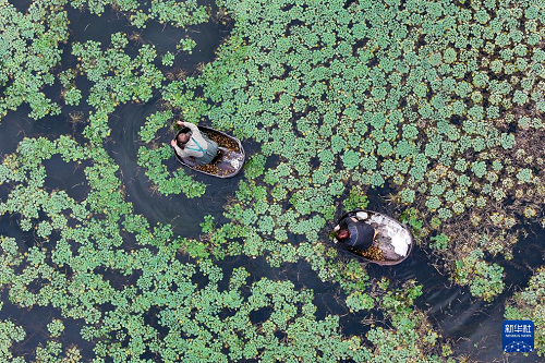 10月22日,浙江省湖州市吳興區(qū)東林鎮(zhèn)泉心村村民劃著菱桶采摘菱角(無人機(jī)照片)。(新華社發(fā) 何偉衛(wèi) 攝)