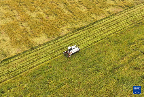 10月22日,湖南省衡陽市衡山縣白果鎮(zhèn)村民駕駛農(nóng)機(jī)收割晚稻(無人機(jī)照片)。(新華社發(fā) 曹正平 攝)
