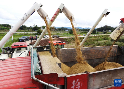 10月22日,在四川省達(dá)州市大竹縣石橋鋪鎮(zhèn)長青村的稻田間,農(nóng)機(jī)手將收獲的水稻裝入運(yùn)糧車。(新華社發(fā) 鄧良奎 攝)