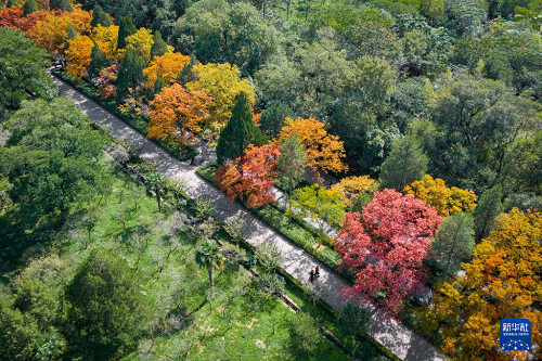 10月23日,游客在江蘇南京明孝陵景區(qū)石象路觀賞秋景(無人機(jī)照片)。(新華社發(fā) 蘇陽 攝)