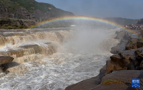 10月27日,位于山西吉縣和陜西宜川縣交界的黃河壺口瀑布景區(qū)天氣晴好,飛濺的水霧在陽光照射下,形成一道壯美的“彩虹橋”。