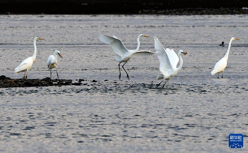 11月3日,在黑龍江省牡丹江市江心島附近的江灘淺流中,白鷺在覓食。(新華社發(fā) 張春祥 攝)