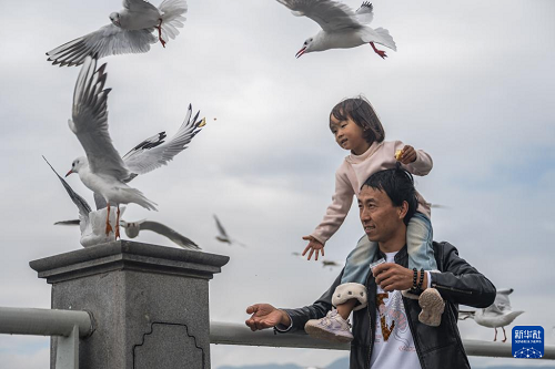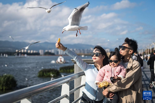 11月10日,游客在云南省昆明市海埂大壩投喂紅嘴鷗。(新華社記者 王冠森 攝)