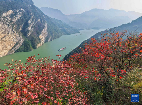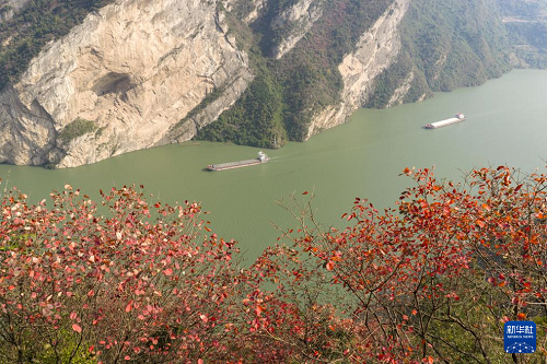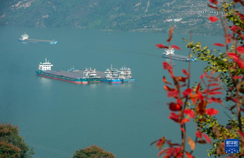 11月16日,船舶行駛在湖北省宜昌市秭歸縣西陵峽水域(無人機(jī)照片)。(新華社發(fā) 雷勇 攝)