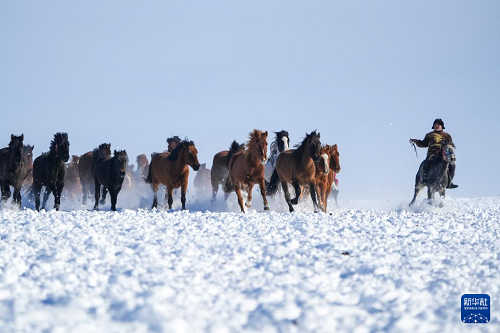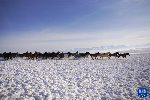 這是1月3日在新疆昭蘇濕地公園拍攝的“天馬踏雪”表演。(新華社記者 徐宏巖 攝)