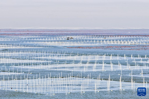 1月8日,漁民在江蘇連云港市海州灣漁場養(yǎng)殖區(qū)收獲條斑紫菜(無人機(jī)照片)。(新華社發(fā) 王健民 攝)