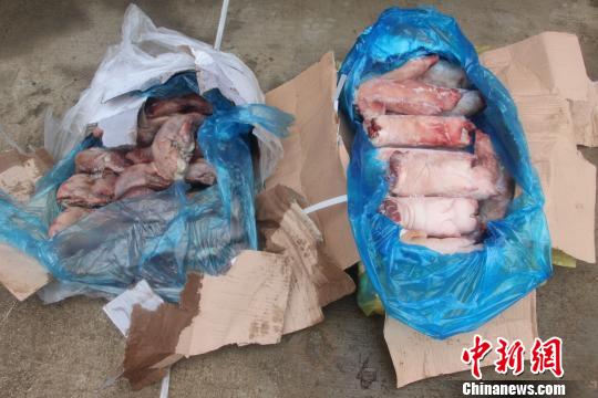 1月25日8時(shí)許,支隊(duì)瀾滄邊境檢查站執(zhí)勤官兵查獲3輛可疑貨車(chē),當(dāng)場(chǎng)從車(chē)廂內(nèi)查獲用麻布袋遮蓋的冰凍雞腳、豬腳等走私凍品105噸。1月27日19時(shí)30分,普洱邊防支隊(duì)支隊(duì)黃莊查緝點(diǎn)在323國(guó)道某段開(kāi)展公開(kāi)查緝,查獲2輛由景洪駛往昆明的貨車(chē),發(fā)現(xiàn)車(chē)內(nèi)拉載的冰凍鴨掌等凍品外包裝均是英文標(biāo)識(shí),且沒(méi)有任何檢驗(yàn)檢疫及運(yùn)輸銷(xiāo)售等合法手續(xù)憑證,經(jīng)稱(chēng)重共計(jì)9噸。如果沒(méi)有被邊防官兵查獲,那這些從境外走私入境的劣質(zhì)過(guò)期冰凍肉質(zhì)品,將在春節(jié)期間流入至少2萬(wàn)戶(hù)家庭的餐桌。