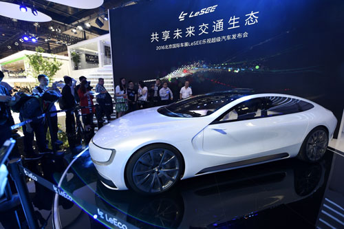 4月25日,觀眾在參觀車展展出的樂(lè)視電動(dòng)汽車。當(dāng)日,2016(第十四屆)北京國(guó)際汽車展覽會(huì)在京開幕。新華社記者鞠煥宗攝