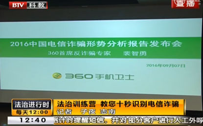 中國經(jīng)濟網(wǎng)北京9月12訊 生活中,當你接到詐騙電話的時候,你要多久能發(fā)現(xiàn)這個騙局呢,10秒?20秒?還是根本識別不出來?9月10日,北京衛(wèi)視《法治進行時》欄目在節(jié)目一開始便拋出了這樣一個問題。面對電信詐騙分子日益多變的手法,如何頭腦清晰地最快識別出騙局?這一期的《法治進行時》和360手機衛(wèi)士專家一起給大家提供了很多實用的建議。