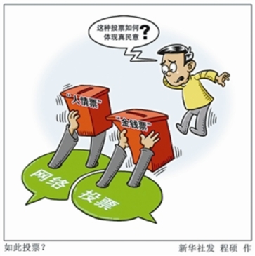 從紅遍大江南北的超女、快男開始,各種評選活動日益增多,最萌寶貝、最美司機(jī)、最美景點(diǎn)等等,你方唱罷我登場,好不熱鬧。投票手段也不斷演進(jìn),手機(jī)短信、網(wǎng)絡(luò)海選、朋友圈投票等,花樣翻新、不一而足。投票方式雖與時俱進(jìn),衡量投票結(jié)果的標(biāo)準(zhǔn)卻未變,票數(shù)多少固化為讓各方“信服”的指標(biāo),如何獲得票數(shù)則一概不論。
