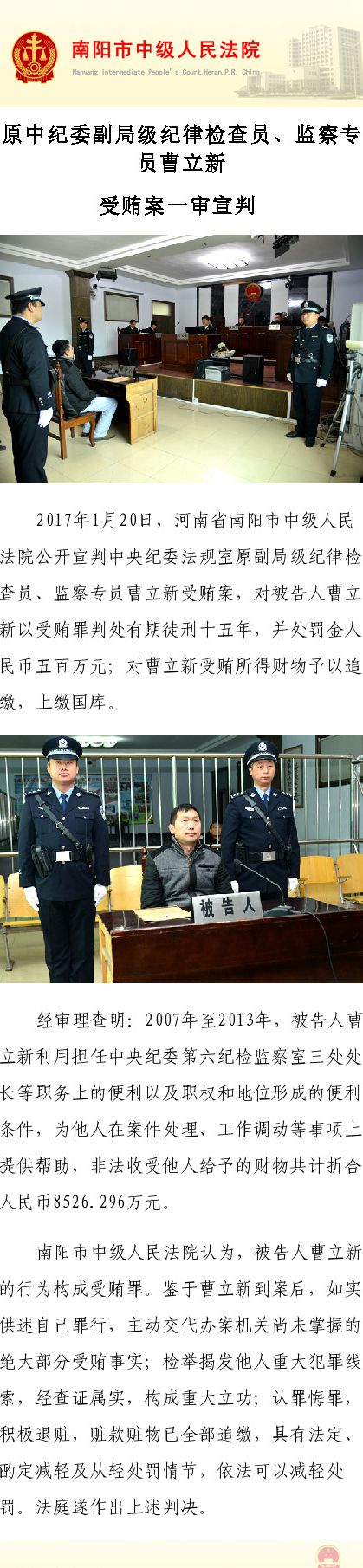 據(jù)南陽市中級(jí)人民法院官方微博消息,2017年1月20日,河南省南陽市中級(jí)人民法院公開宣判中央紀(jì)委法規(guī)室原副局級(jí)紀(jì)律檢查員、監(jiān)察專員曹立新受賄案,對(duì)被告人曹立新以受賄罪判處有期徒刑十五年,并處罰金人民幣五百萬元;對(duì)曹立新受賄所得財(cái)物予以追繳,上繳國庫。