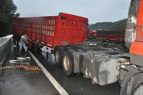 2017年08月26日19時(shí)00分許,高速二支隊(duì)九大隊(duì)民警翟躍、郭騏源接到報(bào)警稱:在五保高速8km處,有一輛紅色東風(fēng)牌重型半掛貨車因出車前未檢查車輛,駕駛存在安全隱患的車輛上路行駛,將掛車脫落,后與中央護(hù)欄發(fā)生碰撞,造成車輛及路產(chǎn)不同程度損壞的道路交通事故。大隊(duì)民警第一時(shí)間趕赴現(xiàn)場,只有超車道可以通行,在做好安全防護(hù)的情況下,及時(shí)詢問當(dāng)事人是否受傷,是否需要撥打“120”急救,并了解了當(dāng)時(shí)的事發(fā)情況。當(dāng)事人稱:“自己一個(gè)人開車去陜西拉煤,走的時(shí)候著急,沒檢查車輛,在行駛過程中,就感覺車輛掛車在擺動(dòng),因?yàn)槭怯晏?,也沒在意,行駛到8km處時(shí),踩剎車過急,加之路面濕滑,掛車突然脫落與中央護(hù)欄發(fā)生碰撞,所幸人沒有受傷?!敝螅窬瘜ΜF(xiàn)場進(jìn)行勘查,并調(diào)取監(jiān)控視頻,發(fā)現(xiàn)車輛在剎車時(shí),車速較快,駕駛員駕駛存在安全隱患的車輛是造成事故發(fā)生的原因。
