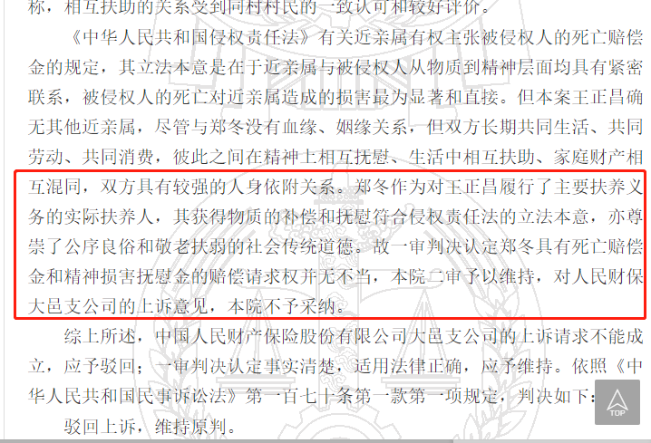 2018年一審,2019年二審,兩級法院均支持鄭冬的訴訟請求,保險(xiǎn)公司共賠31萬余元。理由是:鄭冬與王正昌長期共同生活、共同勞動、共同消費(fèi),彼此之間在精神上相互撫慰、生活中相互扶助、家庭財(cái)產(chǎn)相互混同,雙方具有較強(qiáng)的人身依附關(guān)系。鄭冬作為對王正昌履行了主要扶養(yǎng)義務(wù)的實(shí)際扶養(yǎng)人,應(yīng)當(dāng)獲得物質(zhì)的補(bǔ)償和撫慰,其行為亦尊崇了公序良俗和敬老扶弱的社會傳統(tǒng)道德。