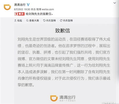 8月29日晚間,滴滴發(fā)出道歉信稱,“官方微博、官方微信的文章未經(jīng)劉翔同意,使用劉翔賽場上照片用于滴滴品牌宣傳推廣,這一行為給劉翔本人造成諸多誤解,在第一時間刪除了含有劉翔先生肖像的所有侵權(quán)鏈接,對于此次侵權(quán)行為,我們表示最誠摯的歉意。”