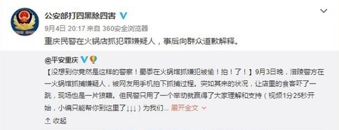 圖為“公安部打四黑除四害”所發(fā)微博截圖。 新華網(wǎng) 金佳緒 近日,一則警方在餐館內(nèi)抓捕犯罪嫌疑人的視頻在網(wǎng)上流傳。視頻顯示,在激烈的抓捕行動結(jié)束后,一名身著便衣的人向餐館內(nèi)所有客人示意并道歉,贏得現(xiàn)場喝彩。視頻被發(fā)布到網(wǎng)絡(luò)后獲得大量網(wǎng)友點贊,公安部官方微博也轉(zhuǎn)發(fā)了該視頻。 事后,有媒體了解到這名道歉者是來自重慶市涪陵區(qū)公安局荔枝派出所的一名民警。據(jù)他介紹,當(dāng)時是正在對一名長期吸販毒的犯罪嫌疑人實施抓捕。由于嫌疑人吸食毒品精神亢奮且隨身攜有刀具,抓捕過程比較激烈,不少店內(nèi)客人都起身圍觀,有些還拿出手機(jī)拍攝。抓捕結(jié)束后,帶隊民警第一時間找來餐館老板,亮明身份后表示警方會妥善處理餐館損失,并且特意向店內(nèi)顧客道歉,于是就有了視頻中顯示的畫面。 贏得官方和民眾一齊點贊的原因主要體現(xiàn)在三個方面:其一,是對違法犯罪行為的嚴(yán)厲打擊點贊。公安機(jī)關(guān)在隨時嚴(yán)密地監(jiān)控違法犯罪行為,依法懲治犯罪分子,全方位地保障著人民群眾的生命財產(chǎn)安全。其二,是對民警直面“鏡頭”、自覺接受群眾對于執(zhí)法過程的監(jiān)督而點贊。執(zhí)法民警可以正確對待“鏡頭下的執(zhí)法”,沒有了以往的“兇、躲、堵”,使整個執(zhí)法過程公正公開,在陽光下運(yùn)行。其三,是為執(zhí)法過程中體現(xiàn)出的警民相互尊重和理解點贊。突如其來的狀況,讓當(dāng)時在場的顧客受到驚嚇,同時抓捕現(xiàn)場也是一片狼藉,但民警真誠的態(tài)度贏得了“圍觀群眾”的充分理解和支持,讓執(zhí)法時的“雷霆萬鈞”擁有濃濃的人情味兒。