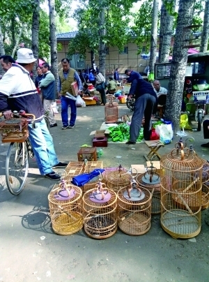 昨天上午,記者來(lái)到北沙灘橋附近,看到臨時(shí)集市藏身于一片楊樹(shù)林里,并被高高的圍墻圍了起來(lái)。樹(shù)林里賣鴿子的、賣小鳥(niǎo)的、賣魚(yú)的、賣蟲(chóng)的、賣古玩的攤子應(yīng)有盡有。其中,售賣小鳥(niǎo)的攤子有五六個(gè),有的把鳥(niǎo)籠直接掛在樹(shù)上,有的則在地上鋪開(kāi)來(lái),幾十只鳥(niǎo)籠排成一排(如圖)。據(jù)了解,有護(hù)鳥(niǎo)志愿者在上周末拍到的圖片中,幾百只鳥(niǎo)兒被關(guān)在籠里售賣。