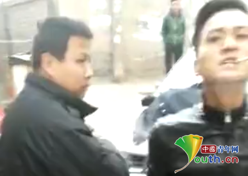 視頻中,與幾名穿黑衣制服男子一同出現(xiàn)的還有一輛沒有牌照、車門上印有“城管”字樣的車輛。在這段48秒的視頻中,一位身穿黑色制服的男子口出污言穢語近十次,并兩次上前推打視頻拍攝者。