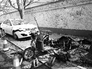 昨日,北京晨報記者來到酒仙橋二街坊附近,在1號樓樓下聚著一群人,正在討論凌晨爆炸的事情,“簡直就是個移動隱患”,“還好不是白天,不然肯定有人受傷”。記者看到,一輛綠色三輪車嚴(yán)重?fù)p毀,車輪扭曲倒在地上,車身部分被炸成了一張橫鋪著的大鐵皮,經(jīng)過灼燒后變得焦黑。三輪車的部分零件丟失,旁邊的樹上掛著鐵條,十幾米外的墻邊散落著三輪車的架子,而車輛原本放置電瓶的地方空無一物。在三輪車旁,一個大煤氣罐被炸成三部分,中間圓筒狀變成一塊鋪展后約1平方米的厚鐵皮,上下兩端則變成兩個圓形的蓋子(如圖)。