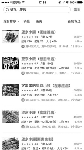 外賣平臺上有15家店自稱“望京小腰”