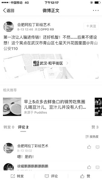 上車后,在確認(rèn)自己已經(jīng)安全的情況下,小王拿出手機(jī),在微博上@青山公安110舉報(bào)了該傳銷窩點(diǎn),并提供了青山區(qū)和平大道附近該小區(qū)的定位。