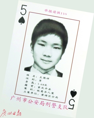 廣州警方昨日通報(bào),近日,黃埔警方偵破一宗16年前的命案積案,抓獲犯罪嫌疑人王圍祥(男,40歲,重慶市人)。此人正是廣州警方撲克牌通緝令中的“黑桃5”。