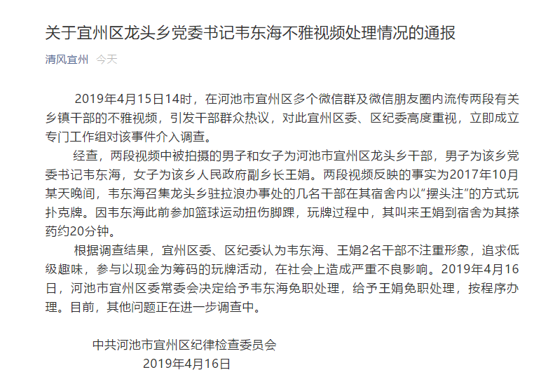 4月16日,中共河池市宜州區(qū)紀(jì)律檢查委員會發(fā)布通報。2019年4月15日14時,在廣西河池市宜州區(qū)多個微信群及微信朋友圈內(nèi)流傳兩段有關(guān)鄉(xiāng)鎮(zhèn)干部的不雅視頻, 經(jīng)查,兩段視頻中被拍攝的男子和女子為河池市宜州區(qū)龍頭鄉(xiāng)干部,男子為該鄉(xiāng)黨委書記韋東海,女子為該鄉(xiāng)人民政府副鄉(xiāng)長王娟。兩段視頻反映的事實為2017年10月某天晚間,韋東海召集龍頭鄉(xiāng)駐拉浪辦事處的幾名干部在其宿舍內(nèi)以“擺頭注”的方式玩撲克牌。因韋東海此前參加籃球運動扭傷腳踝,玩牌過程中,其叫來王娟到宿舍為其搽藥約20分鐘。