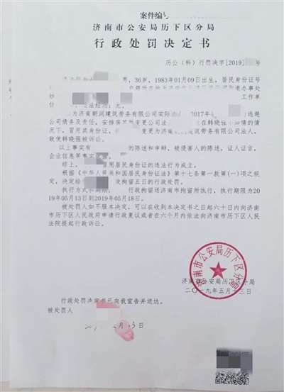 濟南市公安局歷下區(qū)分局出具的行政處罰決定書顯示,冒用韓曉強身份證者被行政拘留5日。 34歲的韓曉強是西南政法大學(xué)的一名教師,老家在山東。今年1月10日,準備回家過年的他,突然發(fā)現(xiàn)無法乘坐飛機和高鐵,查詢后得知名下多出了一家公司,且被濟南市歷下區(qū)人民法院列為拒不執(zhí)行償還1800萬元欠款的“老賴”。目前,冒名者已被濟南警方行政拘留5日。 韓曉強表示,此事對其工作教學(xué)、生活均產(chǎn)生了影響。有律師表示,法院應(yīng)啟動民事再審程序,同時裁定終止原判決的執(zhí)行,消除此事對韓曉強的影響。 新京報訊 韓曉強是一名高校教師,偶然發(fā)現(xiàn)自己名下有一家公司,陷入民事糾紛,欠款1800萬。因未履行還款義務(wù),韓曉強被列為“老賴”。 目前,冒用韓曉強個人信息的人已被行政拘留5日。 高校教師“被法定代表人”后成老賴 今年1月10日,韓曉強準備在APP上訂票回家過年時,收到了被限制高消費的提醒。 在失信被執(zhí)行人網(wǎng)站查詢時,韓曉強發(fā)現(xiàn)自己名下有一個濟南市歷下區(qū)人民法院的民事判決書,原來自己牽扯到一起案件,涉事公司是山東濟南的一家建筑勞務(wù)公司。天眼查APP顯示,該公司2017年有一起民事糾紛,因未按法院判決履行償還1800萬元欠款的義務(wù),韓曉強被列為“老賴”。 該份判決還附帶了一份由該院下達的“限制消費令”,限制“韓曉強不得實施以下高消費及非生活和工作必需的消費行為”,其中就包括了乘坐飛機和高鐵。 對于自己被列為“老賴”,韓曉強告訴新京報記者,自己曾丟過身份證,他猜測“是別人盜用了我的證件”。 因被限制乘坐高鐵、飛機,韓曉強為了跑去濟南解決此事,他不得不坐綠皮火車。他說,交通費、住宿費、律師費前前后后搭進去了兩萬塊錢。 冒用身份證者被行政拘留5日 濟南市公安局歷下區(qū)分局接報后進行了調(diào)查,證明確有人盜用了韓曉強的信息。5月13日,韓曉強拿到該局的行政處罰決定書。 行政處罰決定書顯示,萬林(化名)為濟南朝潤建筑勞務(wù)有限公司實際法定代表人。2017年4月,萬林為逃避公司債務(wù)及責(zé)任,安排36歲的房銘(化名)在韓曉強不知情的情況下,冒用其身份證,將韓曉強變更為該公司法定代表人,致使韓曉強被訴訟。房銘被給予行政拘留五日的處罰。 拿到公安機關(guān)出具的該份證明,韓曉強準備先向法院解除自己的“老賴”身份以及限制消費令。 5月15日,歷下區(qū)市場監(jiān)督管理局一名工作人員稱,因為韓曉強名下有巨額欠款未還,無法為其按照正常的手續(xù)辦理變更。 對話 韓曉強:毫無瓜葛的公司讓我身背污點 韓曉強稱,自己工作、生活無緣無故受到影響,將追究當事人(即涉事公司變更前的原法定代表人)及工商部門的責(zé)任,希望得到經(jīng)濟補償。 維權(quán)經(jīng)濟支出兩萬多元 新京報:被限制出行后帶來哪些影響? 韓曉強:我的出差、開會什么的,都被限制掉了。從今年1月到現(xiàn)在,我的工作教學(xué)、生活都受到了影響,包括出差開會、大學(xué)研究等。 除了牽扯精力,也有經(jīng)濟上的損失,包括律師費,還有一些亂七八糟的支出,損失了兩萬多元。 新京報:什么時候得知自己名下有公司的? 韓曉強:當時不是被限制出行嘛,我就通過網(wǎng)絡(luò)查詢發(fā)現(xiàn)一份濟南市歷下區(qū)人民法院的行政判決書及限制消費令,名字、身份證號都是我的,覺得自己很無辜,怎么就突然多出來一家公司了呢? 新京報:你之前知道這家公司嗎? 韓曉強:完全不知道。除我的老家是山東的之外,我與這家公司毫無瓜葛。 新京報:你的身份證是何時丟失的?是否進行了掛失? 韓曉強:2012年到2013年之間,當時我就在山東,坐車時掉的,事后也進行了掛失,但是我咨詢了公安機關(guān),說沒有用,只要身份證在有效期內(nèi),不過期,就還能一直用,只要不是“剪角作廢”(如該人戶口遷出時,會由遷出地派出所戶籍民警剪角,證明已遷出),不會作廢,所以說現(xiàn)在有人可以同時使用五六張身份證,這種情況是存在的。 擬追究當事人及工商部門責(zé)任 新京報:目前存在哪些困難? 韓曉強:公安機關(guān)作出的行政處罰決定書雖然證明了有冒名者,但是工商局那邊手續(xù)蠻多的。因為我沒有償還已判決生效的1800萬元欠款,所以我一直是公司的法定代表人。 我認為工商局拿到虛假材料、冒用的證件后,也沒有進行仔細審核,肯定操作失誤或不嚴謹。我希望工商部門可以公開道歉。 新京報:冒用者最后被公安機關(guān)行政拘留5日。對此結(jié)果,你怎么看? 韓曉強:我覺得冒用者盜用我的信息,屬于嚴重犯罪,感覺處罰力度有些輕,畢竟影響持續(xù)到現(xiàn)在,給我造成這么大損失。這事像污點一樣伴隨著我。 新京報:是否會向當事人申請賠償? 韓曉強:其實我是有這個想法的,但是不知道最后能不能得到補償。我的訴求也跟律師溝通過,準備起訴當事人和工商局,也有對結(jié)果進行預(yù)測和考慮,現(xiàn)在還挺棘手的,不知道最后能不能如愿。 觀點 法院應(yīng)根據(jù)行政處罰決定書啟動再審 上海大邦律師事務(wù)所律師丁金坤認為,冒名者都已經(jīng)查到了,說明韓曉強是無辜的,應(yīng)該主動撤銷其法定代表人身份。法院原來的判決有誤,也應(yīng)該主動再審糾正,“自己可以申訴,法院也可以主動提
