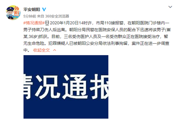 人民網(wǎng)北京1月20日電 (朱紫陽)據(jù)北京市公安局朝陽分局官方微博消息,1月20日14時許,北京市公安局110接報警,在朝陽醫(yī)院門診樓內(nèi)一男子持菜刀傷人后逃離。朝陽分局民警在醫(yī)院安保人員的配合下迅速將該男子(崔某,36歲)抓獲。目前,三名受傷醫(yī)護人員及一名受傷群眾正在醫(yī)院接受治療,暫無生命危險。犯罪嫌疑人已被朝陽公安分局依法刑事拘留,案件正在進一步調(diào)查中。